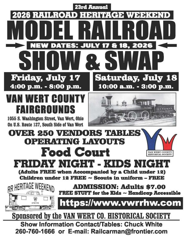 Van Wert Historical Society Model Train and Show Swap July 18 @ 8:00 am - July 19 @ 5:00 pm Van Wert County Fairgrounds 1055 S. Washington St., Van Wert, Ohio